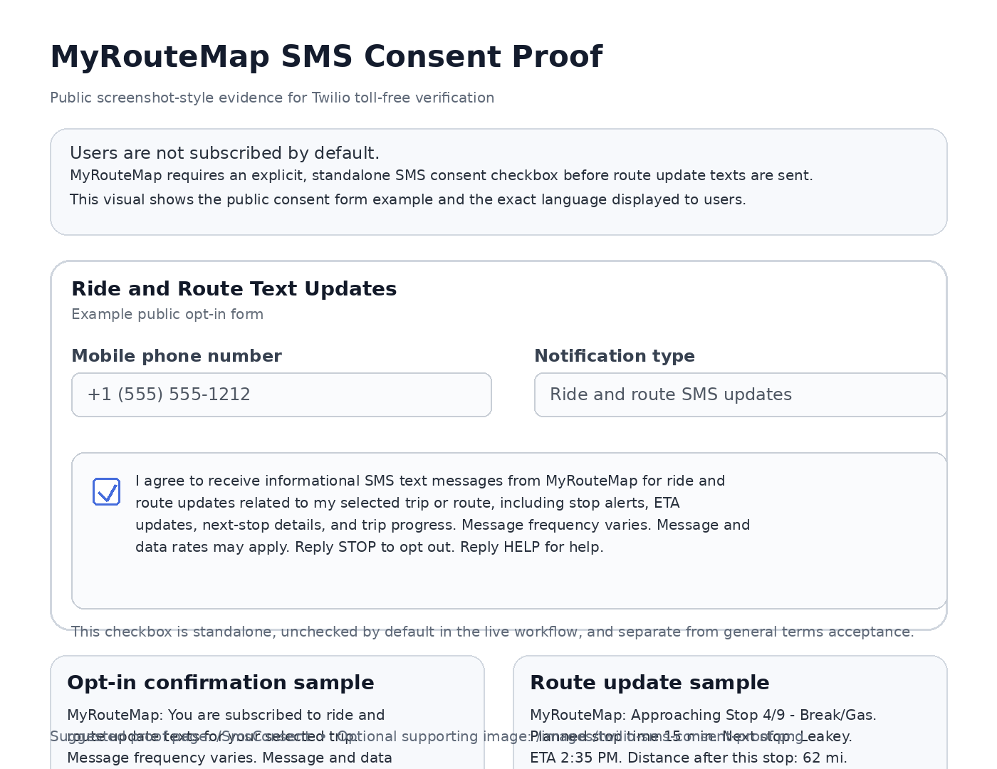 Users are not subscribed by default. MyRouteMap requires an explicit, standalone consent action before route update texts are sent.